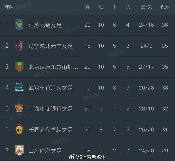 截至9月6日,各队积分排名呈现高度胶着态势。江苏无锡女足20轮战罢积36分,暂居积分榜首位;辽宁沈北和丰女足18轮积35分紧随其后,且该队将于9月7日对阵“副班长”河南万仙山女足,若能顺利取胜,有望反超江苏无锡女足登顶;北京东方雨虹女足则在本轮比赛中,凭借1-0的比分小胜武汉车谷江大女足,积35分成功升至积分榜第三名;武汉车谷江大女足遭遇两连败,积33分排名跌至第四位,争冠形势面临压力。