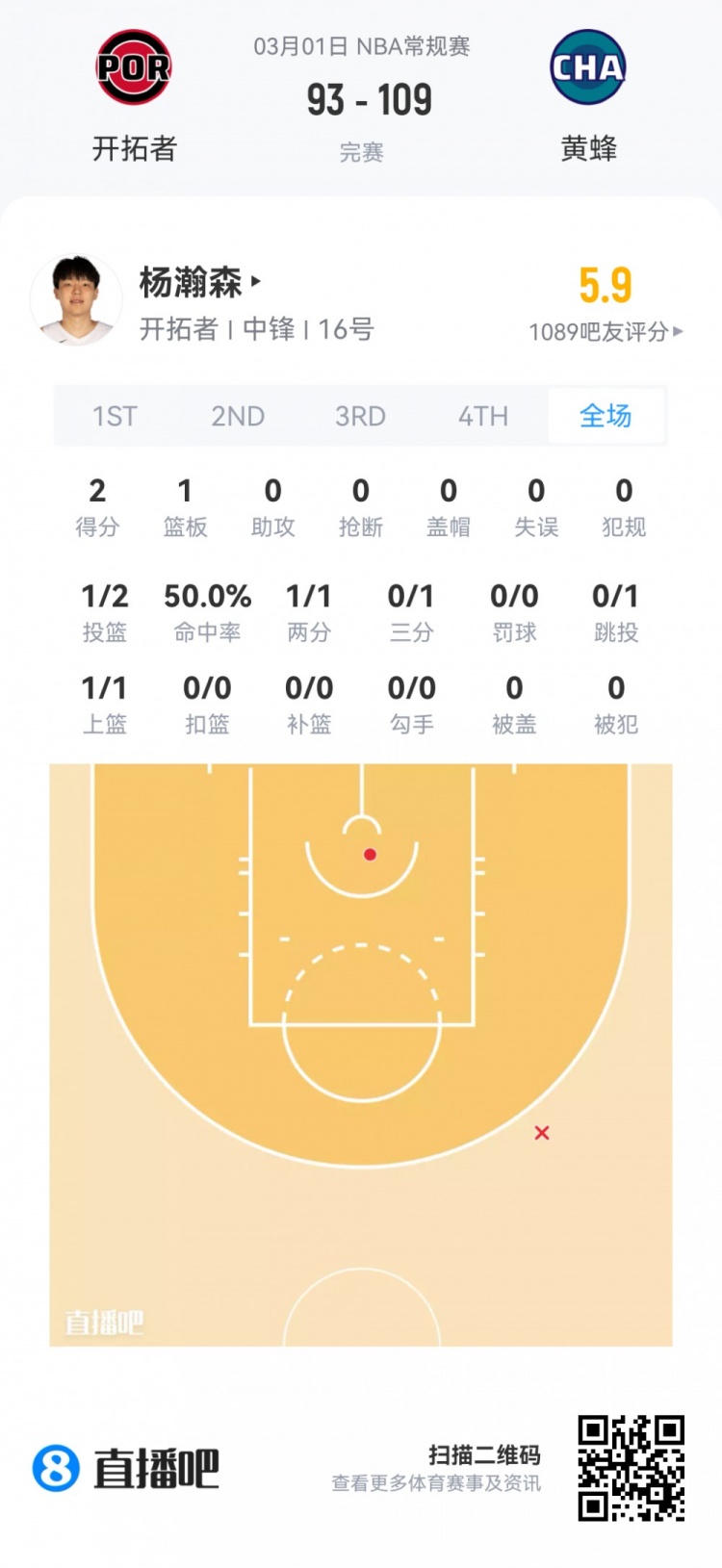 开拓者首轮16号秀杨瀚森 登场2.3分钟